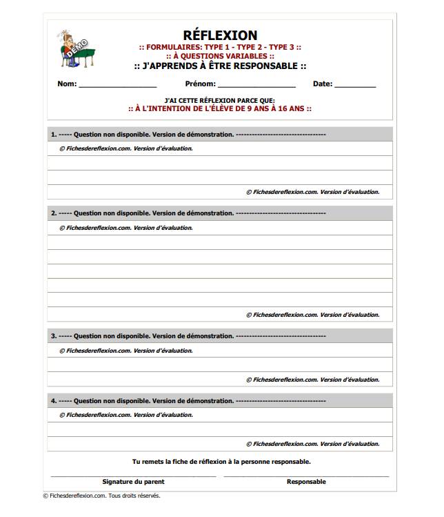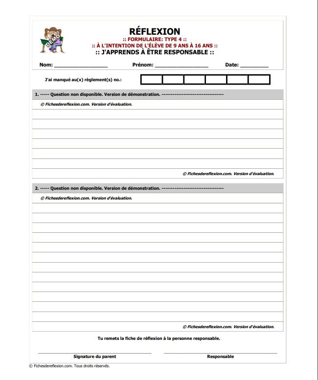 - 9 modèles de formulaires sont présentement disponibles en ligne sur fichesdereflexion.com. L'un de ces formulaires, l'élève peut le remplir directement à l'écran et l'imprimer.